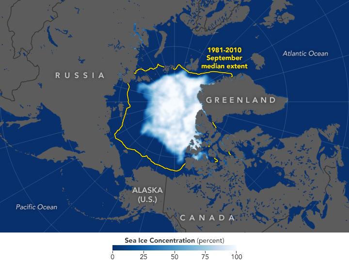 Buzların erime mevsimi sonu, yani 18 Eylül 2019’da, 1981-2010 yılları arasındaki ortalama ölçüyle kıyaslandığında, ölçülen en düşük ikinci deniz buz miktarı. Kaynak: Nasa Dünya Gözlemevi.