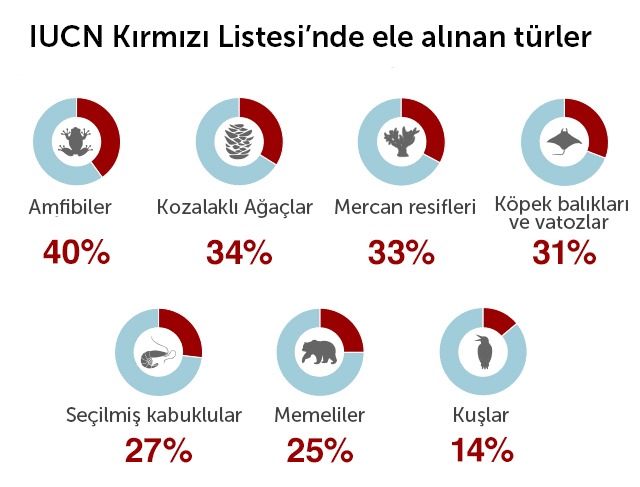Uluslararası Doğayı Koruma Birliği (IUCN) tarafından incelenen yaklaşık 100.000 türün çeyreğinden fazlası yok olma tehlikesiyle karşı karşıyadır; tüm amfibilerin % 40’ı, tüm memelilerin % 25’i, tüm kozalaklı hayvanların % 34’ü, tüm kuşların % 14’ü, mercan resiflerinin % 33’ü, köpekbalıkları ve vatozların % 31’i. Biyolojik çeşitlilik ve Ekosistem Hizmetleri Hükümetlerarası Bilim-Politika Platformu (IPBES), insan faaliyetleri yüzünden bir milyon hayvan ve bitki türünün yok olma tehlikesiyle karşı karşıya olduğunu belirtiyor.