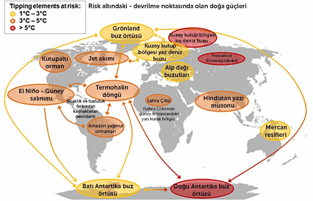 Dünya sistemindeki kritik eşik bölgeleri; farklı ısınma seviyelerinde tetiklenme riski ve bu kritik eşiklerin birbirlerini nasıl besleyeceklerini gösteren grafik. Steffen ve ark., PNAS, 2018.