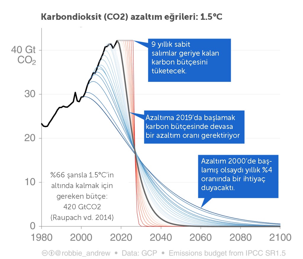 Grafik 2/3’lük bir ihtimalle (%66) kabul edilen 1.5°C’lik küresel ısınma hedefinin altında kalmak için uygun bütçeyi gösteriyor.. Salımları azaltmadığımız sürece gelecekte daha da ciddi kesintilere ihtiyaç duyulacağını görüyorsunuz.Yaşanan gecikme sebebiyle, bu hedef içinde kalmaya devam etmek istiyorsak salımları hızlı bir şekilde azaltmaktan başka bir alternatif yok.