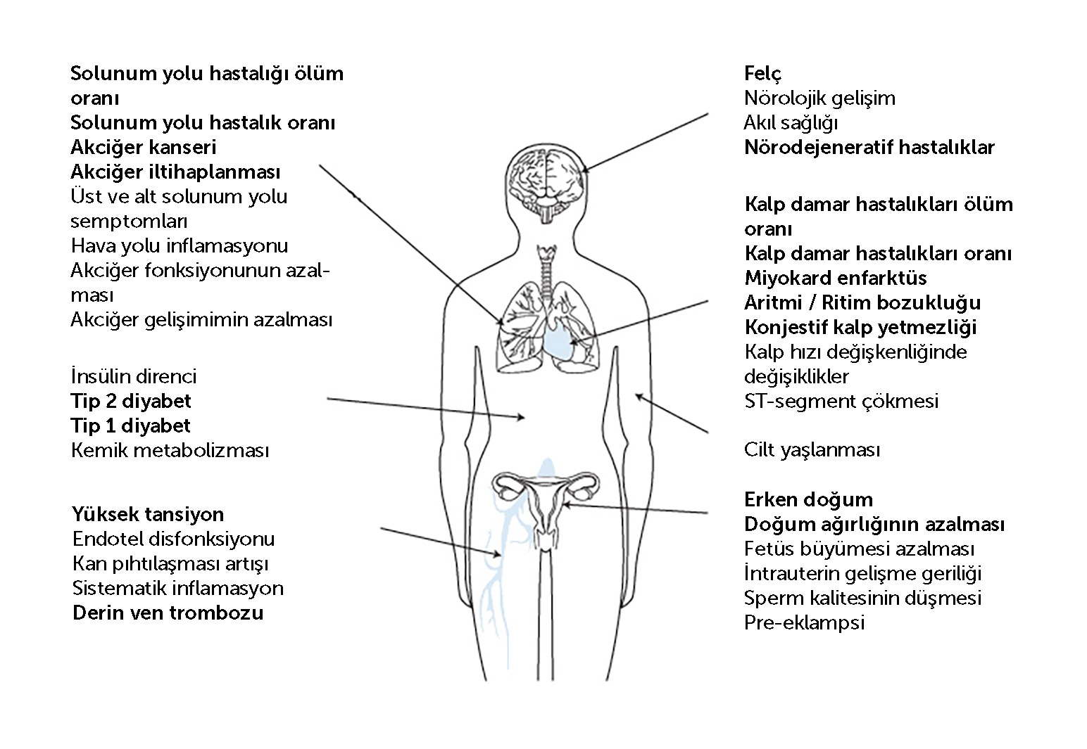 Bu ölümlerin büyük bir kısmı, kirli hava içerisinde bulunan, akciğerlerin derinlerine nüfuz edebilen küçük parçacıklara maruz kalmaktan kaynaklanır. Küçük çocuklar, astım gibi önceden var olan sağlık sorunları olanlar ve yaşlı insanlar bu konuda özellikle savunmasızdır. Havayı kirleten maddelere maruz kalmak pek çok hastalığın doğrudan nedenidir: Akciğer kanseri ve solunum yolu enfeksiyonlarından felçe; demans ve hatta diyabete kadar.